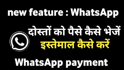 यह फीचर हाल ही में व्हाट्सएप में लॉन्च किया गया है और आप इसे प्ले स्टोर में अपडेट कर सकते हैं यदि आप इस फीचर का उपयोग करना चाहते हैं, तो सबसे पहले आपको व्हाट्सएप को अपडेट करना होगा जिसे आप प्ले स्टोर में जाकर अपडेट कर सकते हैं और आपको भुगतान करने का विकल्प मिलेगा। , ताकि आप अपने दोस्तों को पैसे भेज सकें, बहुत आसान तरीका बस भुगतान में क्लिक करना है और अपना यूपीआई नंबर दर्ज करना है और पैसे भेजना बहुत आसान तरीका है और बहुत उपयोगी है
